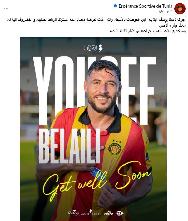 وأفاد النادي في بيان رسمي بأن بلايلي سيخضع قريبًا لعملية جراحية، تليها مرحلة تأهيل تحت إشراف الطاقم الطبي للفريق، مؤكداً أن اللاعب سيحتاج لبعض الوقت للتعافي قبل العودة إلى الملاعب.