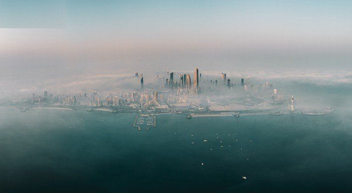 وغطى الضباب الكثيف اليوم كذلك أرجاء البلاد في مشهد استثنائي أخفى معظم معالمها العمرانية فيما بدت أطراف الأبراج فقط شاهقة فوق الغيوم وطبقة الضباب.