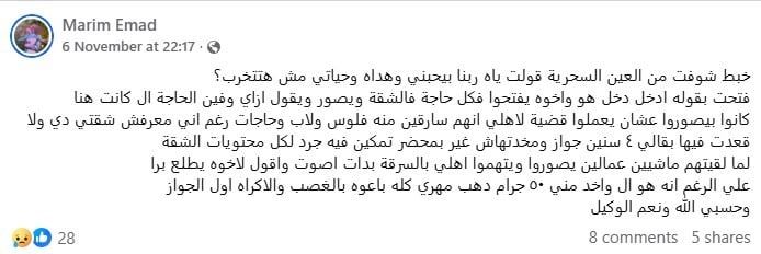 شهدت اليوم الحاضر انتشاراً واسعاً لمقطع فيديو مؤثرة، عصره زوجة مصرية تدعى مريم عماد وهي تغيث بعد اقتحام زوجها وأفرادها الذين حصلوا عليها بحكمها، في وجود طفلها الوحيد.