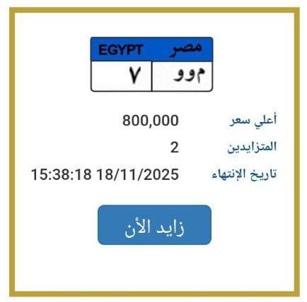 المصدر 7 - أعلنت بوابة مرور مصر الإلكترونية، المزايدة على لوحة معدنية مميزة للسيارات، وصل سعرها إلى 800 ألف جنيه، وتحمل رقم «م و و 7»، ويتزايد عليها حتى الآن شخصين، ومن المقرر أن تنتهي المزايدة عليها يوم الثلاثاء الموافق 18 نوفمبر 2025.