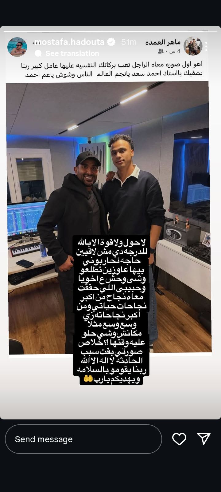 وقال متابع لـ مصطفي حدوتة في منشور رصده موقع تحيا مصر: " أول صورة مع الراجل تعب.. بركاتك النفسية عليها عامل كبير، ربنا يشفيك يا أستاذ احمد سعد يا نجم العالم، الناس وشوش يا عم أحمد".