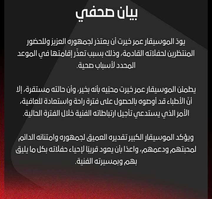 وقال في البيان: يود الموسيقار عمر خيرت أن يعتذر لجمهوره العزيز وللحضور المنتظرين لحفلاته القادمة، بسبب تعذّر إقامتها في الموعد المحدد لأسباب صحية، ويؤكد عمر خيرت تقديره العميق لجمهوره وامتنانه الدائم لمحبتهم ودعمهم، واعدًا بالعودة قريبًا لإحياء حفلاته بكل ما يليق بهم وبمسيرته الفنية.