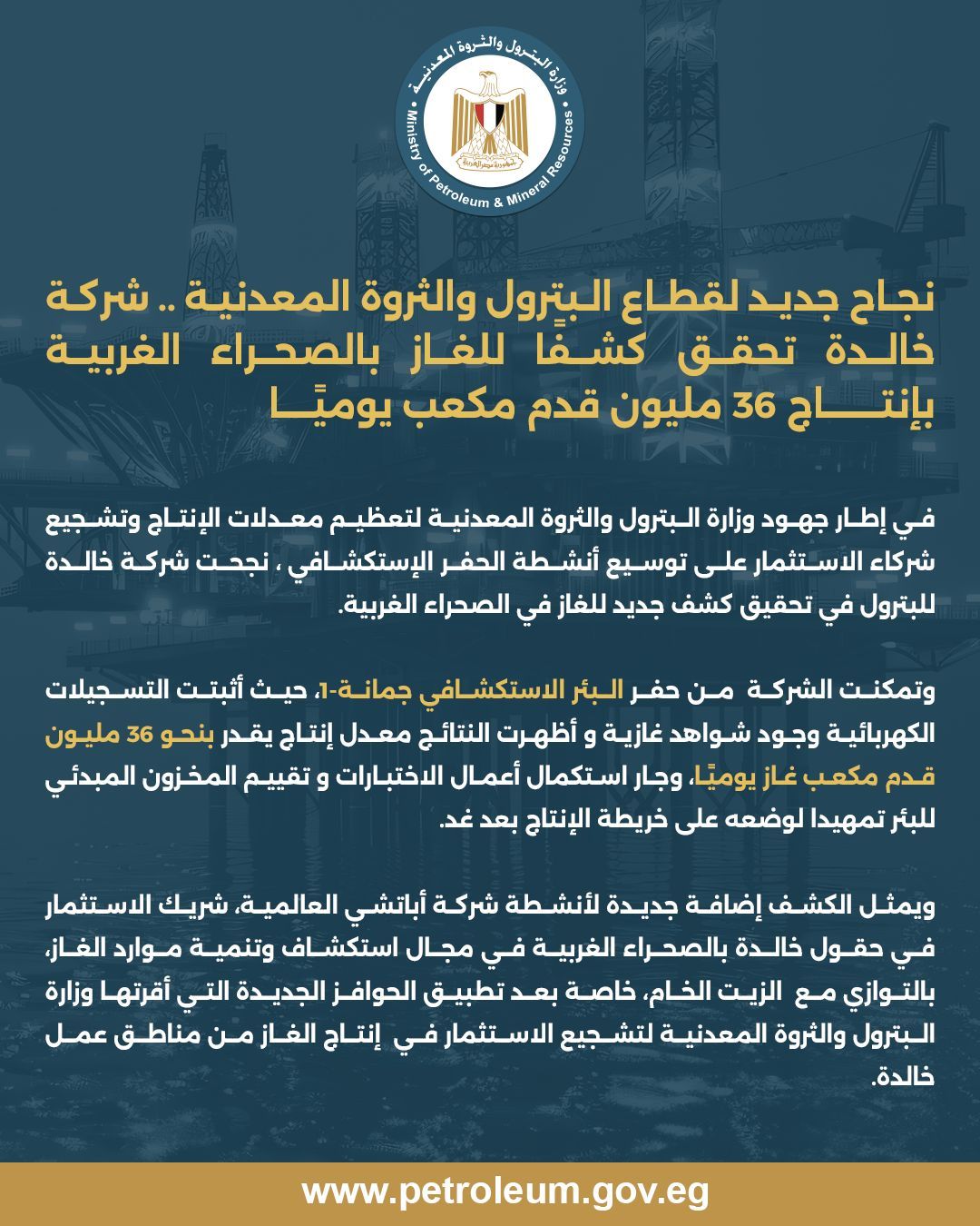 المصدر 7 - في إطار جهود وزارة البترول والثروة المعدنية لتعظيم معدلات الإنتاج وتشجيع شركاء الاستثمار على توسيع أنشطة الحفر الإستكشافي ، نجحت شركة خالدة للبترول في تحقيق كشف جديد للغاز في الصحراء الغربية.