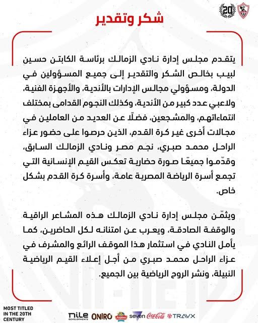 تحيا مصر، ويثمن مجلس إدارة نادي الزمالك هذه المشاعر الراقية والوقفة الصادقة ويعرب عن امتنانه لكل الحاضرين، كما يأمل النادي في استثمار هذا الموقف الرائع والمشرف في عزاء الراحل محمد صبري من أجل إعلاء القيم الرياضية النبيلة ونشر الروح الرياضية بين الجميع.