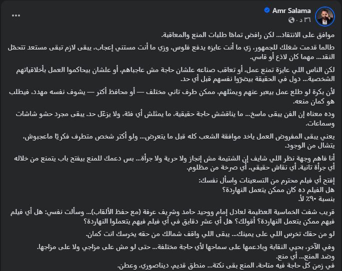وكتب المخرج عمرو سلامة، منشورا يوضح فيه استيائه، وفقا لما رصده موقع تحيا مصر، وذلك عبر حسابه بموقع التواصل الاجتماعي فيسبوك، قائلا: موافق على الانتقادات لكن رافض تمامًا طلبات المنع والمعاقبة، طالما قدمت شغلك للجمهور زي ما أنت عايزه يدفع فلوس، وزي ما أنت مستني إعجاب، يبقى لازم تبقى مستعد تتحمّل النقد… مهما كان لاذع أو قاسي.