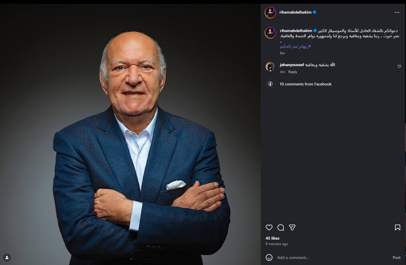 وكتبت الفنانة ريهام عبد الحكيم، منشورا توجه من خلاله الدعاء للموسيقار عمر خيرت، وفقا لما رصده موقع تحيا مصر، عبر موقع التواصل الاجتماعي إنستجرام، قائلة: دعواتكم بالشفاء العاجل للأستاذ والموسيقار الكبير عمر خيرت، ربنا يشفيه ويعافيه ويرجع لنا ولجمهوره بوافر الصحة والعافية.