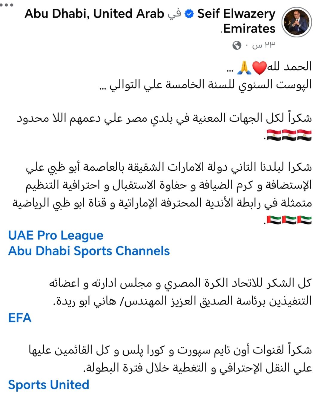واستهل الوزيري منشوره قائلاً: "الحمد لله... البوست السنوي للسنة الخامسة على التوالي، شكراً لكل الجهات المعنية في بلدي مصر على دعمهم اللامحدود"، مؤكداً امتنانه للدعم الكبير الذي تحظى به الرياضة المصرية من مختلف المؤسسات داخل الدولة.