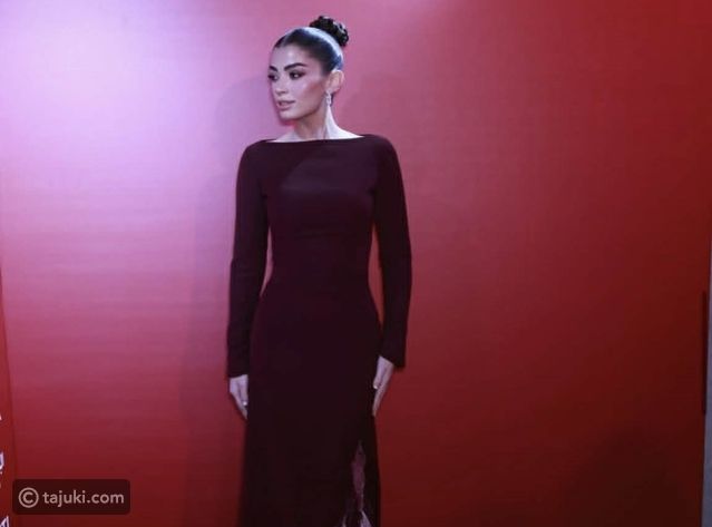 اختارت ليلى زاهر فستانًا بلون البرجندي المخملي، وهو لون غني ودافئ يعكس الرقي والجرأة في آن واحد. تميز الفستان بتصميمه الأنيق ذي الأكمام الطويلة، مما أضفى عليها مظهرًا ملكيًا محتشمًا وجذابًا في آن واحد. اللون المخملي العميق للبرجندي، مع تصميمه الذي ينساب برشاقة، جعلها تبدو كلوحة فنية متحركة على السجادة الحمراء.