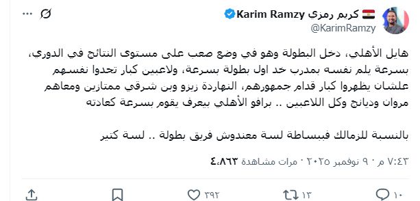 الاعلامى كريم رمزى وعبر صفحته على منصة إكس كتب معلقاً :