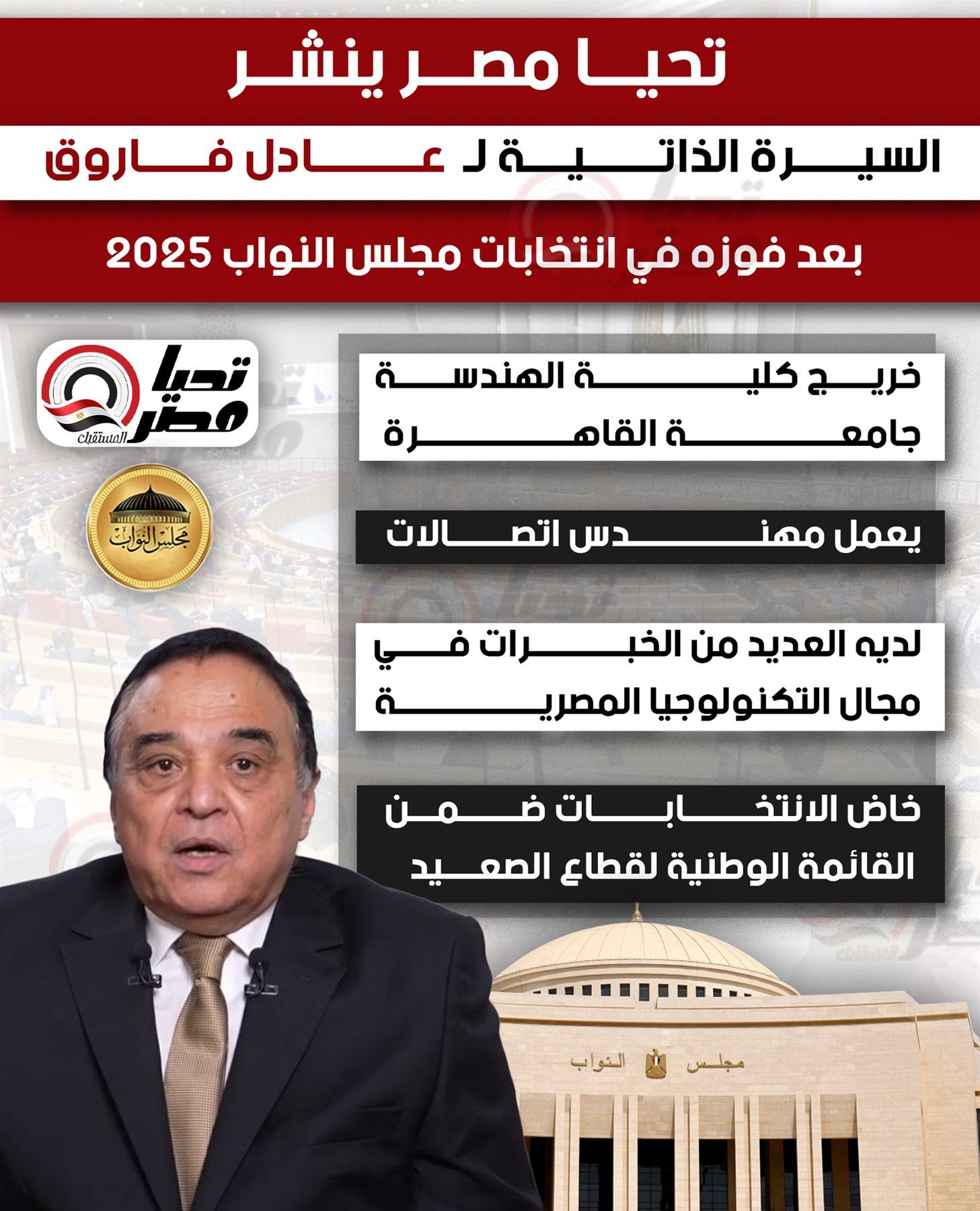 تحيا مصر ينشر السيرة الذاتية لـ عادل فاروق بعد فوزه في انتخابات مجلس النواب 2025 - المصدر 7, اليوم الثلاثاء 18 نوفمبر 2025 05:05 مساءً