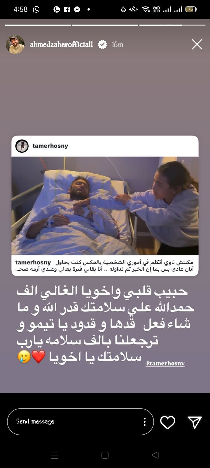 وكتب الفنان أحمد زاهر، رسالة دعم للفنان تامر حسني، وفقا لما رصده موقع تحيا مصر، عبر استوري صفحته الرسمية على موقع التواصل الاجتماعي إنستجرام قائلا: حبيب قلبي واخويا الغالي ألف حمدالله على سلامتك قدر الله وماشاء فعل قدها وقدود يا تيمو وترجعلنا بألف سلامة يارب سلامتك يا اخويا.