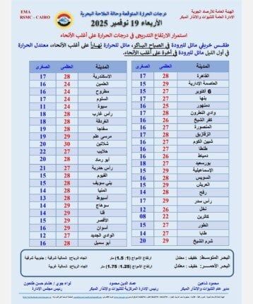 العظمى بالقاهرة 28.. الأرصاد تعلن حالة طقس غدا الأربعاء 19 نوفمبر | بيان بدرجات الحرارة - المصدر 7, اليوم الثلاثاء 18 نوفمبر 2025 05:25 مساءً