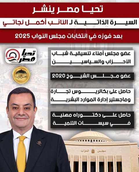 تحيا مصر ينشر السيرة الذاتية للنائب أكمل نجاتي بعد فوزه في انتخابات مجلس النواب 2025 - المصدر 7, اليوم الثلاثاء 18 نوفمبر 2025 05:55 مساءً