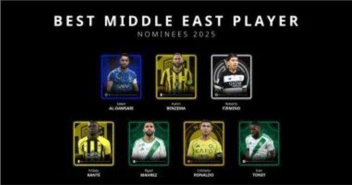ويتنافس 7 نجوم على جائزة أفضل لاعب بالشرق الأوسط في حفل جوائز جلوب سوكر 2025، وهم كريستيانو رونالدو (النصر)، كريم بنزيما (الاتحاد)، سالم الدوسري (الهلال)، رياض محرز (الأهلي)، روبيرتو فيرمينو (الأهلي/السد)، نجولو كانتي (الاتحاد)، إيفان توني (الأهلي).