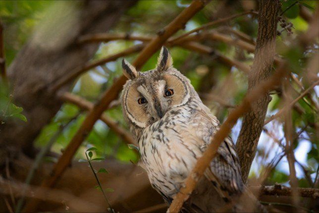 وذكر أن هذه البومة تتميز بخصلتين من الريش تشبهان الأذنين الطويلتين وعيناها البرتقالية اللافتة وتفضل الاختباء في المناطق كثيفة الأشجار أثناء النهار والمناطق الزراعية المظللة.