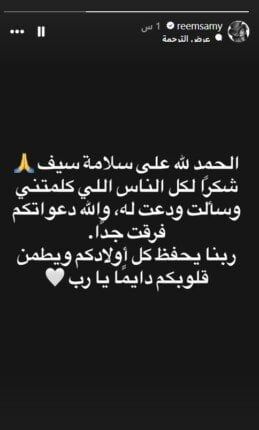 وكتبت ريم سامي ستوري عبر حسابها الرسمي بموقع التواصل الاجتماعي «فيسبوك»: «الحمد لله على سلامة سيف، شكرا لكل الناس اللي كلمتني وسألت ودعت له، والله دعواتكم فرقت جدا، ربنا يحفظ كل أولادكم ويطمن قلوبكم دايما يا رب».