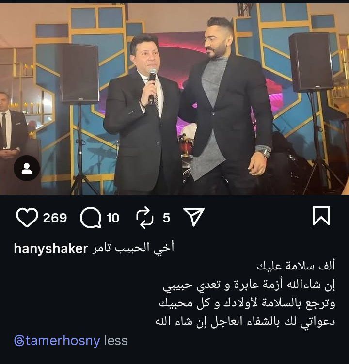 ونشر هاني شاكر صورة له رفقة نجم الجيل تامر حسني، وعلق عليها في منشور رصده موقع تحيا مصر على حسابه الرسمي بموقع تبادل الصور والفيديوهات انستجرام: "أخي الحبيب تامر، إن شاء الله أزمة عابرة وتعدي يا حبيبي، وترجع بالسلامة لأولادك وكل محبيك، دعواتي لك بالشفاء العاجل".