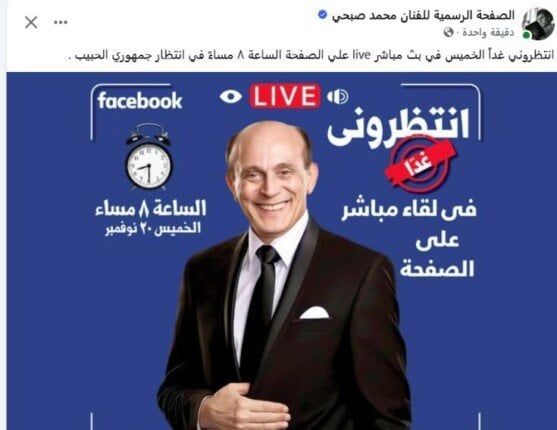 وأعلن محمد صبحي، عبر حسابه الرسمي بموقع التواصل الاجتماعي «فيسبوك»، عن خروجه في بث مباشر للجمهور بعد استقرار حالته الصحية، قائلا: «انتظروني غدًا الخميس في بث مباشر على الصفحة الساعة 8 مساءً، في انتظار جمهوري الحبيب»، ذلك بعد خروجه من المستشفى عقب تماثل حالته الصحية».