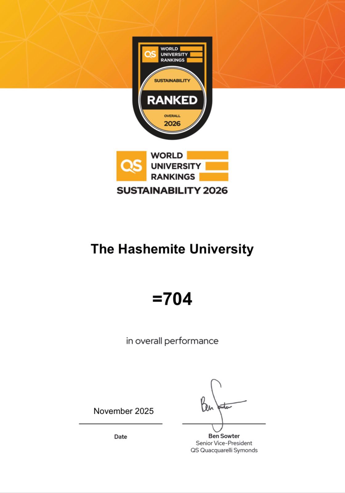 الجامعة الهاشمية تتقدم 164 مرتبة عالميًا في تصنيف QS للاستدامة 2026 وتحتل المركز الثالث محليًا - المصدر 7, اليوم الأربعاء 19 نوفمبر 2025 06:24 مساءً