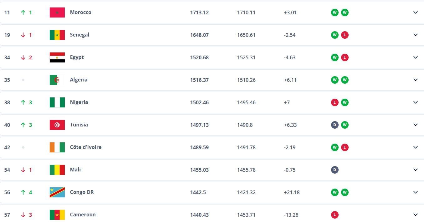 وتواجد منتخب مصر في الترتيب 34 مقابل 32 في آخر تحديث للمنتخبات العالمية، كما تراجع الفراعنة للمركز الثالث قاريًا بعد صدارة المغرب ووصافة السنغال.