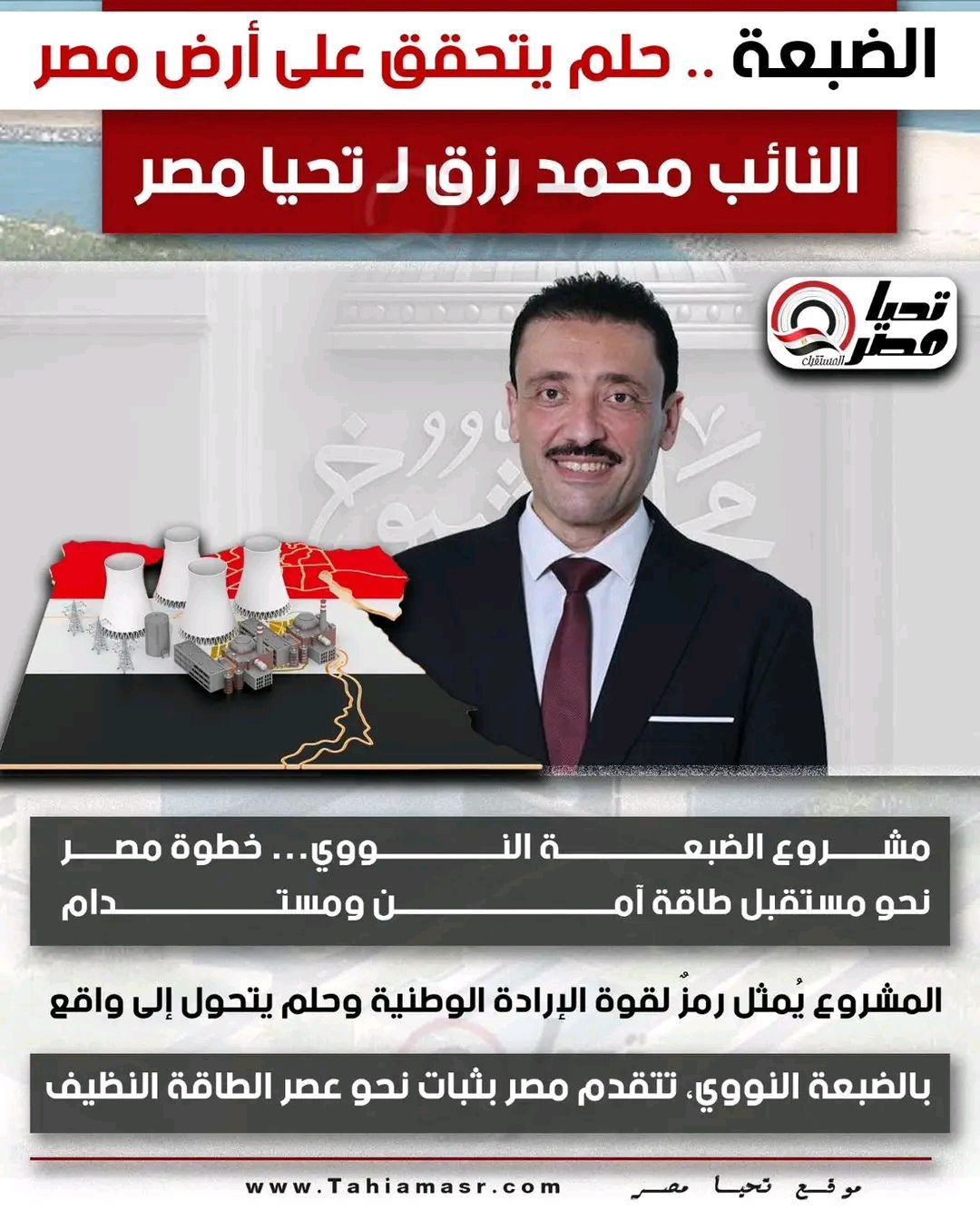 الضبعة.. حلم يتحقق على أرض مصر..النائب محمد رزق لـ «تحيا مصر»: مشروع الضبعة النووي خطوة مصر نحو مستقبل طاقة آمن ومستدام