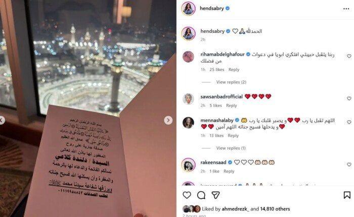 وشاركت هند صبري، عبر حسابها الرسمي بموقع تداول الصور والفيديوهات «إنستجرام»، أحدث ظهور من أمام الحرم المكي، معلقة عليه قائلة: «الحمد لله»، حيث ظهرت مرتدية الحجاب، وتدعو والدتها الراحلة من أمام الكعبة.