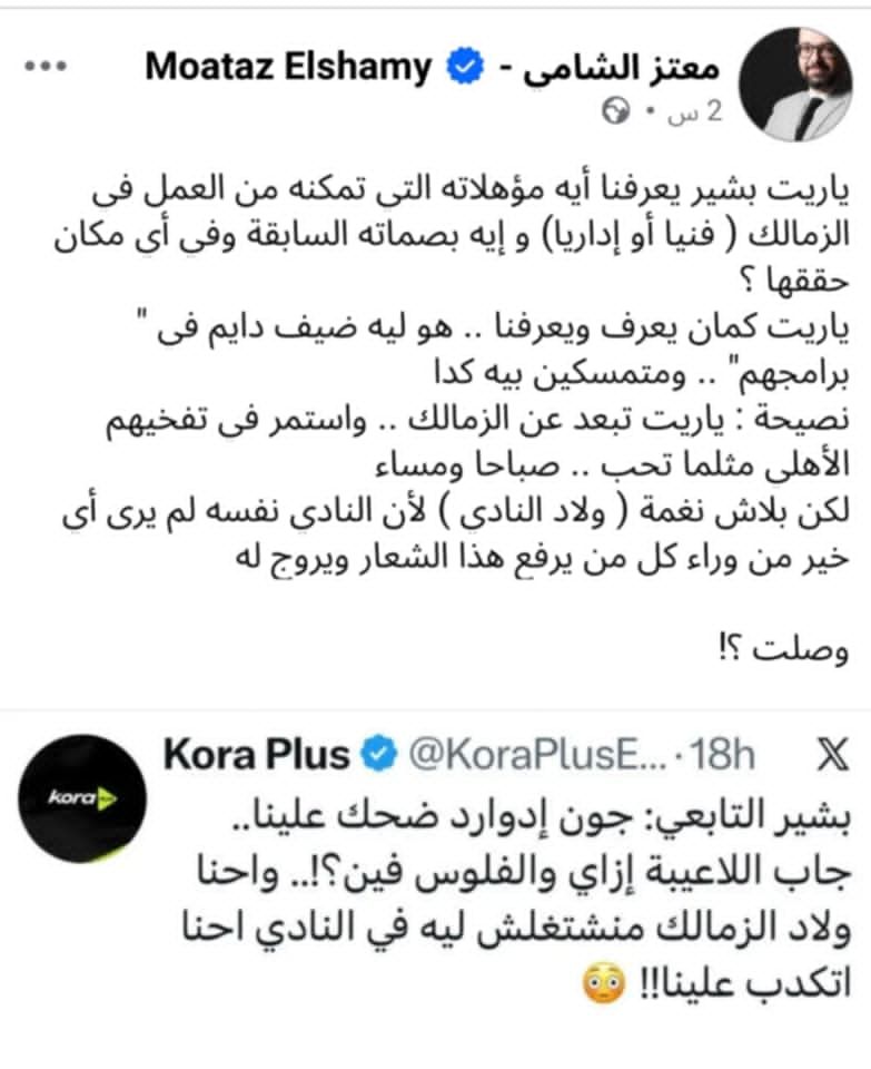 المصدر 7 - بشير التابعي، علق الناقد الرياضي معتز الشامي على التصريحات الأخيرة التي أدلى بها بشير التابعي، مدافع الزمالك السابق.