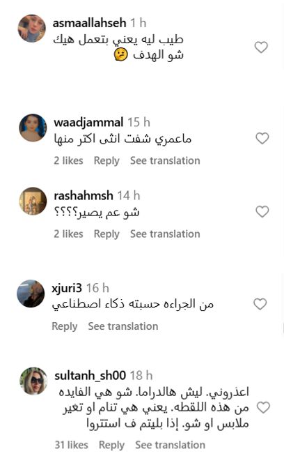 في حين جاء في تعليقات المنتقدين: "اعذروني. ليش هالدراما. شو هي الفايدة من هذه اللقطة. يعني هي تنام او تغير ملابس أو شو.."، وأضاف آخر: "طيب ليه يعني بتعمل هيك شو الهدف؟"