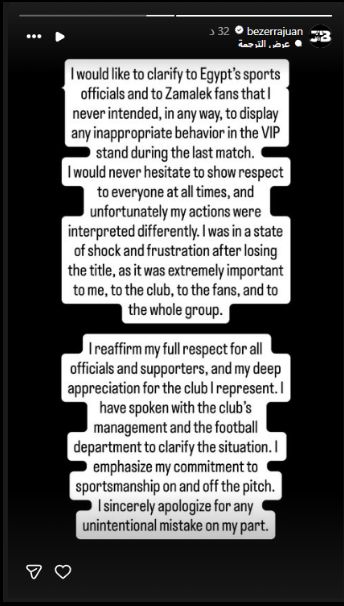 وقال في بيانه : أود أن أوضح للمسؤولين الرياضيين في مصر ولجماهير الزمالك أنني لم أقصد مطلقًا إظهار أي سلوك غير لائق على منصة كبار الشخصيات خلال المباراة الأخيرة.