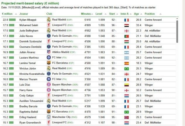 وفيما يلي قائمة أعلى 10 لاعبين استحقاقًا للرواتب في العالم لعام 2025 بحسب المرصد الدولي لكرة القدم (CIES):