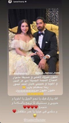 المصدر 7 - مازح رجل الأعمال ومدرب اللياقة البدنية أحمد تيمور، الفنان تامر حسني بعد تهنئته بزواجهما الذي أقيم أمس الثلاثاء، حيث أشار إلى زوج مي عز الدين بأنه من سيحافظ على سلمى في إشارة إلى فيلم «عمر وسلمى».
