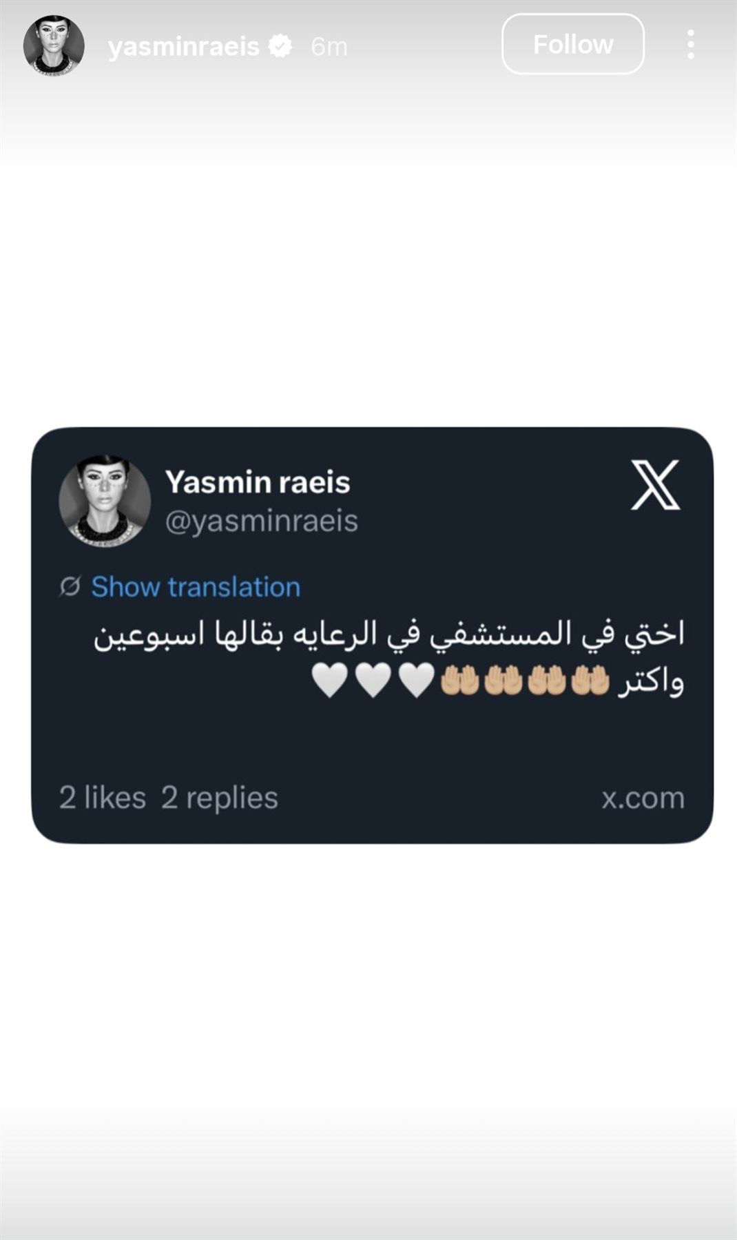 ياسمين رئيس تعلن دخول شقيقتها المستشفى