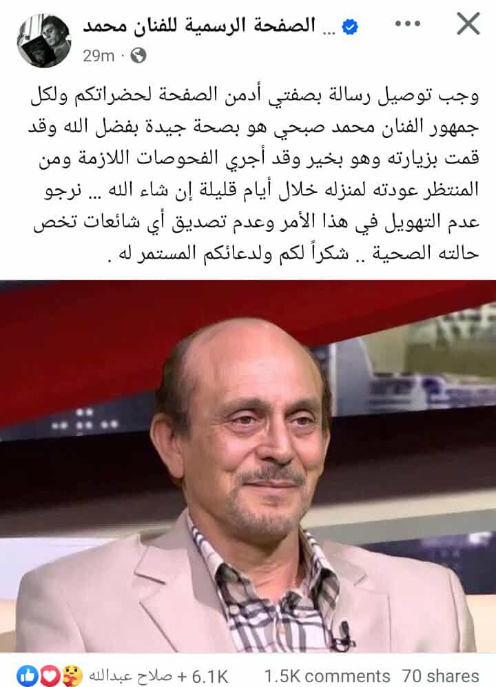 وجاء في الصفحة الرسمية لـ محمد صبحي على موقع التواصل الاجتماعي فيسبوك، وفقا لما رصده موقع تحيا مصر: وجب توصيل رسالة بصفتي أدمن الصفحة لحضراتكم ولكل جمهور الفنان محمد صبحي هو بصحة جيدة بفضل الله وقد قمت بزيارته وهو بخير وقد أجري الفحوصات اللازمة ومن المنتظر عودته لمنزله خلال أيام قليلة إن شاء الله … نرجو عدم التهويل في هذا الأمر وعدم تصديق أي شائعات تخص حالته الصحية .. شكراً لكم ولدعائكم المستمر له.