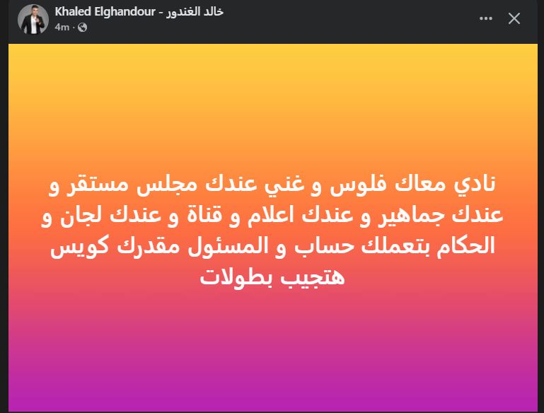 تحيا مصر، وكتب خالد الغندور عبر حسابه الرسمي"فيس بوك": نادي معاك فلوس،و غني عندك مجلس مستقر، و عندك جماهير و عندك اعلام ، وقناة و عندك لجان و الحكام بتعملك حساب و المسئول مقدرك كويس هتجيب بطولات".