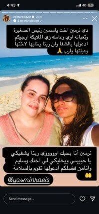 وأضافت زينة: «أرجوكم أدعولها بالشفا وان ربنا يخليها لأختها وعيلتها يارب، نرمين أنا بحبك اوي ربنا يشفيكي يا حبيبتي ويخليكي لي اختك وسليم وأنا، من فضلكم أدعولها تقوم بالسلامة».