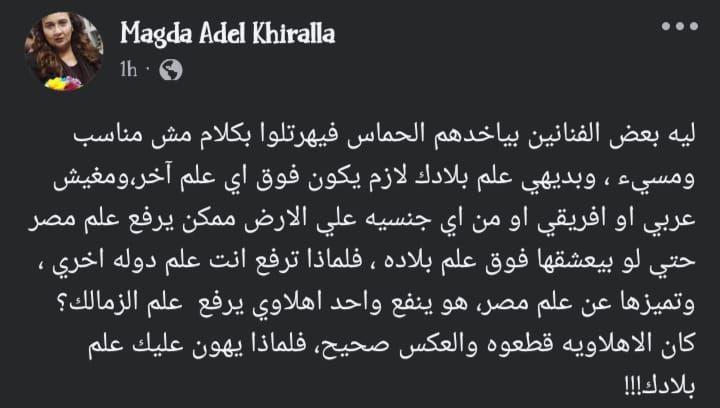 وتابعت: فلماذا ترفع أنت علم دولة أخرى وتميزه عن علم مصر؟ هل ينفع واحد أهلاوي يرفع علم الزمالك؟ كان الأهلاوية قطعوه، والعكس صحيح، فلماذا يهون عليك علم بلادك؟