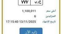 المصدر 7 - اشتعلت المزايدة الإلكترونية على لوحة سيارة مميزة تحمل حروف وأرقام «ع ر ب 777»، عبر بوابة مرور مصر الإلكترونية، بعدما تجاوز سعرها حاجز المليون و100 ألف جنيه، وسط منافسة بين 6 أشخاص حتى الآن، قبل ساعات من إغلاق المزاد المقرر غدًا الخميس 13 نوفمبر 2025.