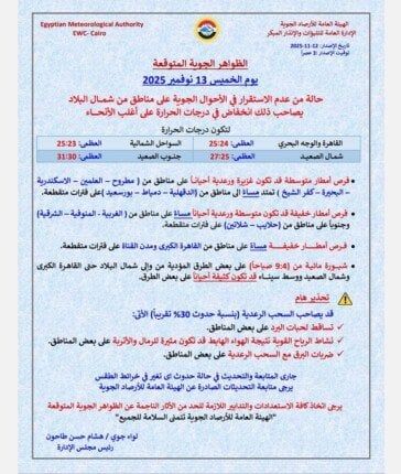 المصدر 7 - كشفتِ الهيئة العامة للأرصاد الجوية عن حالة الطقس اليوم الخميس 13 نوفمبر 2025، موضحةً الظواهر الجوية ودرجات الحرارة المتوقعة في محافظات ومدن مصر.