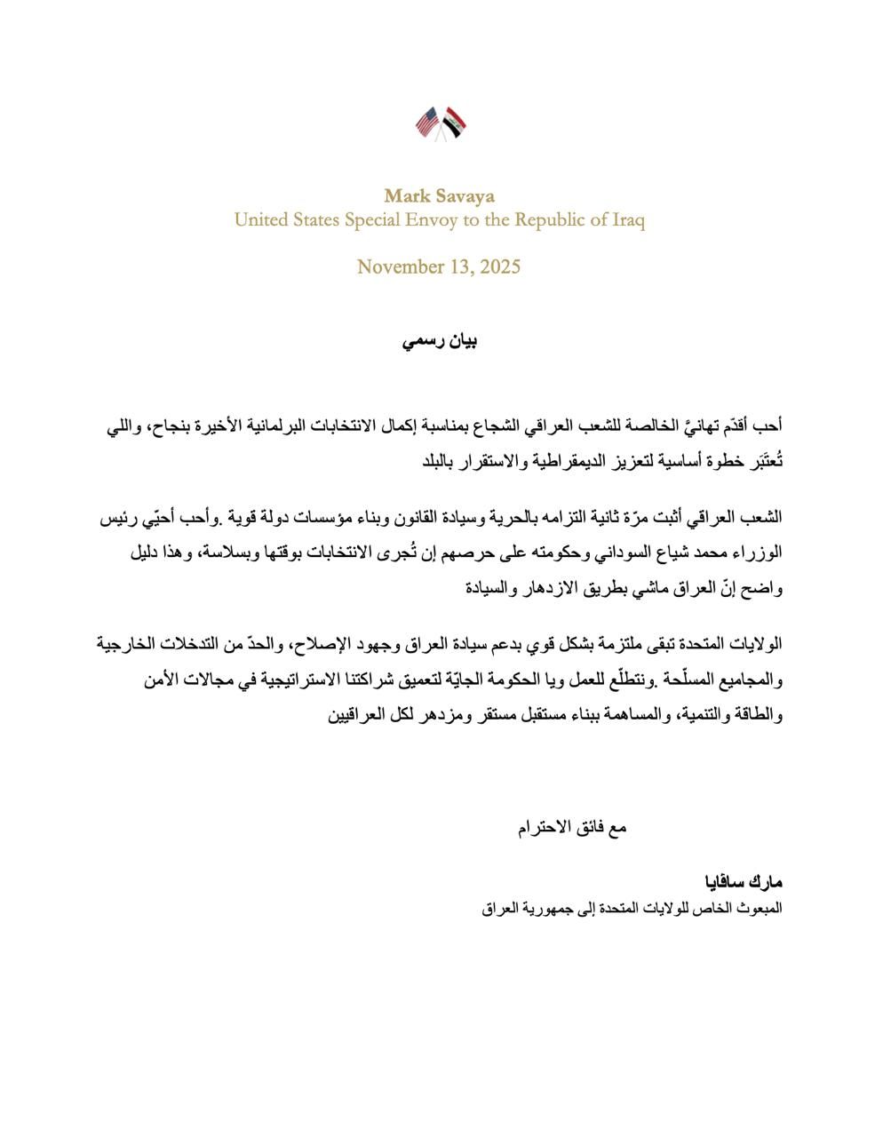 المصدر 7 - هنّأ المبعوث الأميركي الخاص إلى العراق، مارك سفايا، الشعب العراقي على إتمام الانتخابات البرلمانية الأخيرة بنجاح، معتبراً أنّ هذا الحدث يشكّل "خطوة أساسية لتعزيز الديمقراطية والاستقرار في البلاد".