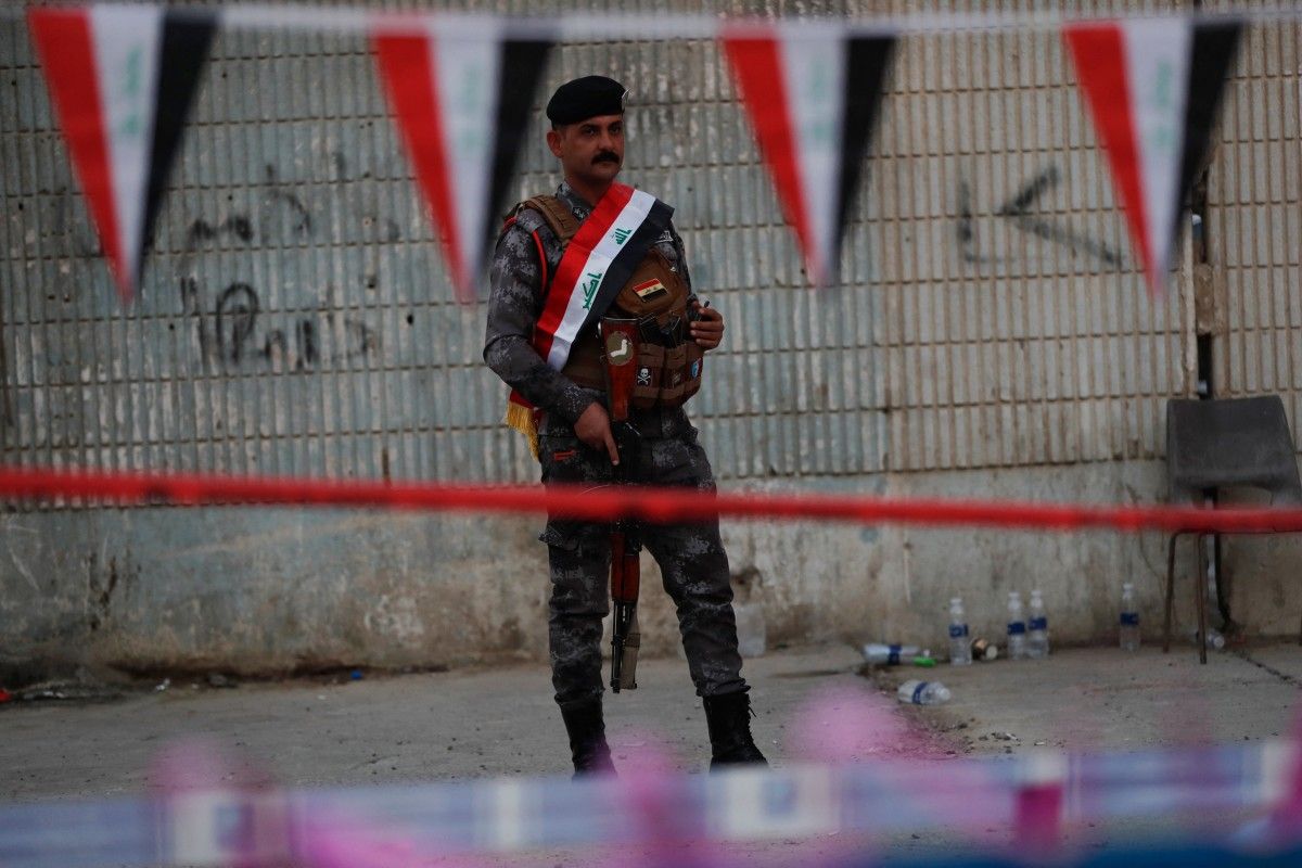 أحد أفراد قوات الأمن العراقية يحرس مركز اقتراع في منطقة الأعظمية ببغداد. (أ ف ب)