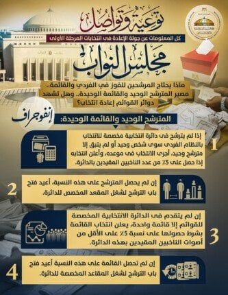 وتضمنت المعلومات، التي قدمتها الوزارة، توضيحات حول جولة الإعادة فى انتخابات المرحلة الأولى لمجلس النواب، وماذا يحتاج المرشحين للفوز في الفردي والقائمة، ومصير المترشح الوحيد والقائمة الوحيدة، وهل تشهد دوائر القوائم إعادة انتخاب.