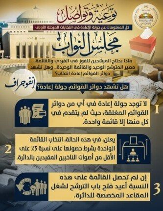 وأشارت الوزارة إلى أنه بالنسبة لنصاب الفوز، فيعلن انتخاب المترشح أو القائمة الحاصل على الأغلبية المطلقة للأصوات الصحيحة في الدائرة الانتخابية «50%+1»، وإذا لم تتوفر هذه الأغلبية، أعيد الانتخاب بين المترشحين أو القائمتين الحاصلين على أكبر عدد من الأصوات.