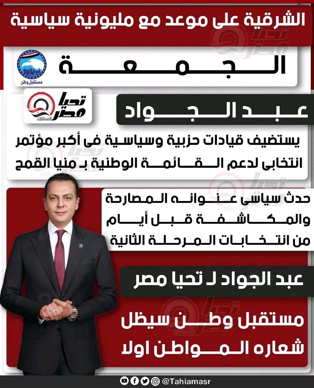 المصدر 7 - تشهد محافظة الشرقية يوم الجمعة المقبل حدثًا سياسيًا كبيرًا، حيث يستعد النائب أحمد عبد الجواد، نائب رئيس حزب مستقبل وطن، وأمينه العام المساعد، لتنظيم أكبر مؤتمر انتخابي لدعم القائمة الوطنية في دائرة منيا القمح، بمشاركة عدد كبير من القيادات الحزبية والسياسية من مختلف المحافظات.