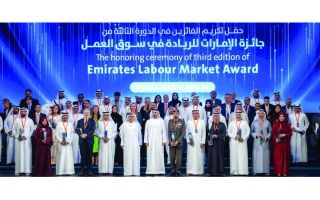 المصدر 7 - تحت رعاية سمو الشيخ منصور بن زايد آل نهيان، نائب رئيس الدولة نائب رئيس مجلس الوزراء رئيس ديوان الرئاسة، كرّم سمو الشيخ ذياب بن محمد بن زايد آل نهيان، نائب رئيس ديوان الرئاسة للشؤون التنموية وأسر الشهداء، ووزير الموارد البشرية والتوطين وزير التعليم العالي والبحث العلمي بالإنابة رئيس اللجنة الإشرافية لجائزة الإمارات للريادة في سوق العمل، الدكتور عبدالرحمن العور، الفائزين في الدورة الثالثة من الجائزة الأولى من نوعها في الدولة لتكريم الممارسات الرائدة والمتميزة في سوق العمل على مستوى شركات القطاع الخاص والقوى العاملة، خلال حفل نظَّمته الوزارة في مركز أدنيك أبوظبي.