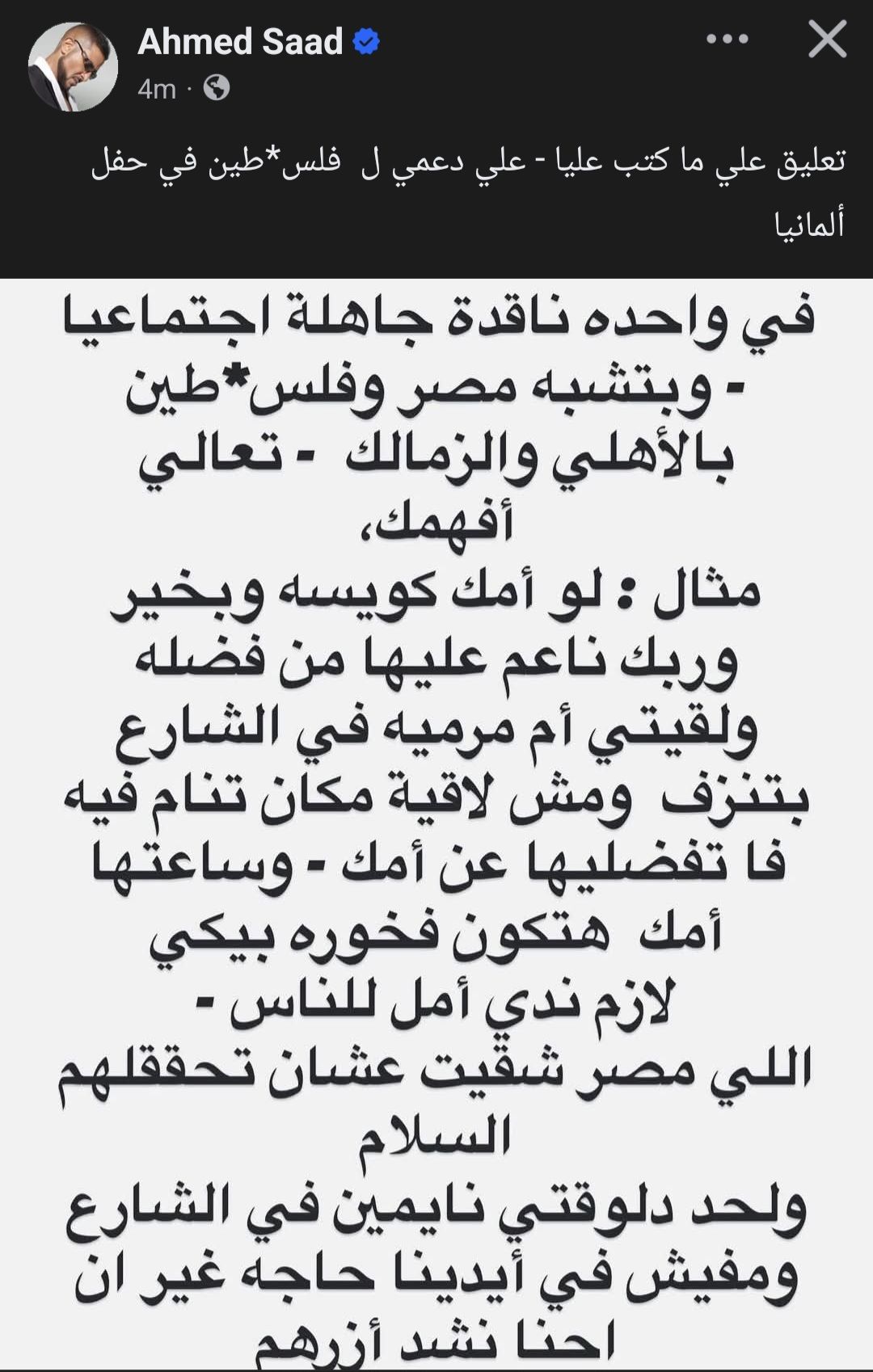 وكتب سعد في منشور رصده موقع تحيا مصر على حسابه بموقع «إنستجرام» قائلاً: «في واحدة ناقدة جاهلة اجتماعيًا، وبتشبه مصر وفلسطين بالأهلي والزمالك، تعالي أفهمك… مثال: لو أمك كويسة وبخير وربنا ناعم عليها من فضله، ولقيتي أم تانية مرمية في الشارع بتنزف ومش لاقية مكان تنام فيه، طبيعي تفضليها عن أمك، وساعتها أمك هتكون فخورة بيكي».
